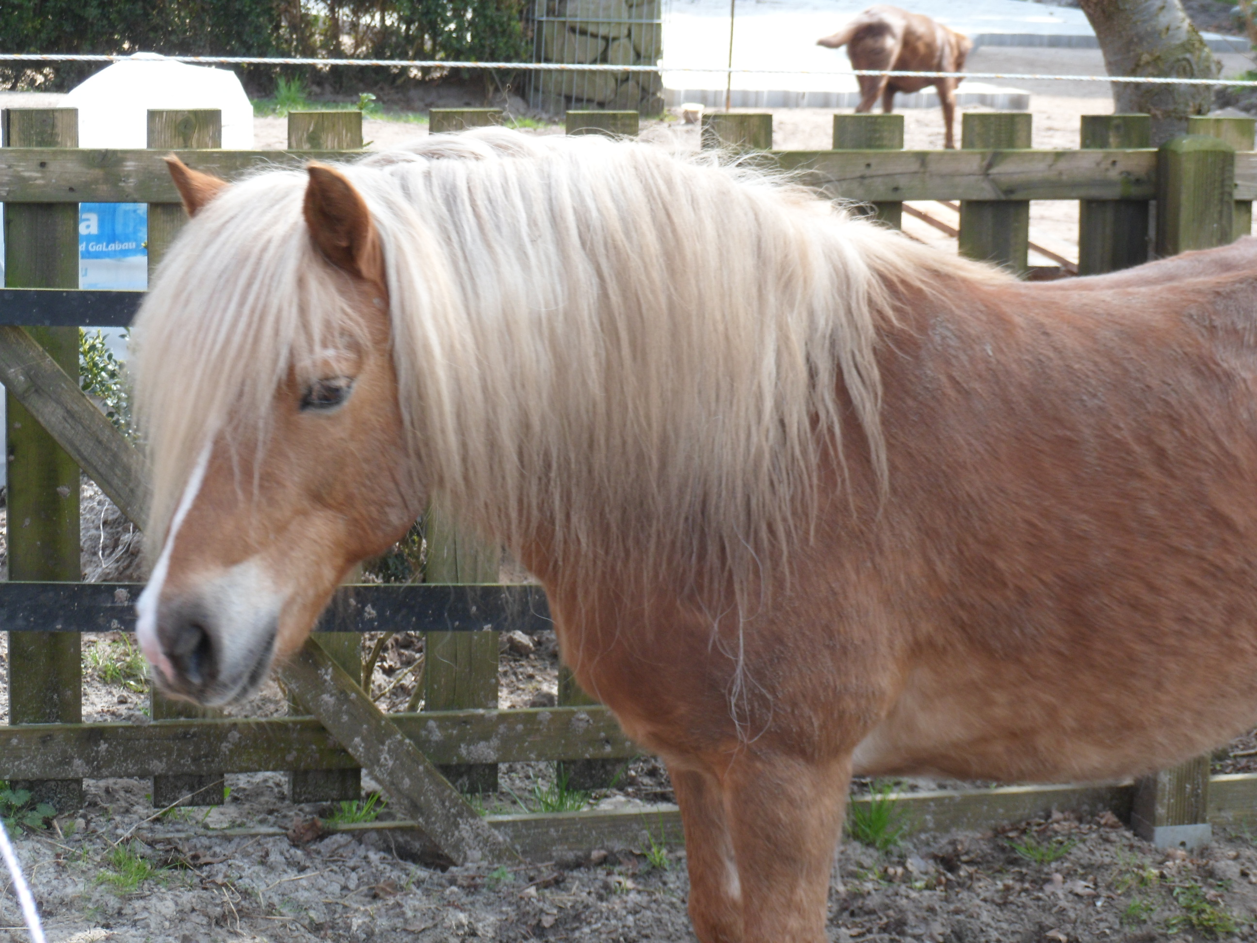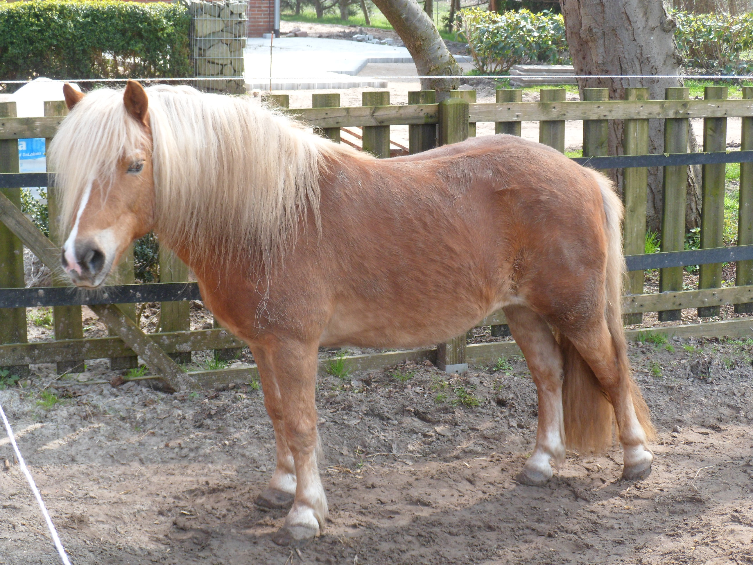 Die sehr kleine Haflinger-Pony-Mix Stute Flora lebte auf einem Kinderponyhof. Dort lehrte sie vielen Kindern das Reiten und zog die Kutsche. Der Tritt eines Pferdes traf ihr Auge und seitdem erblindet sie schleichend. Bei Flora müssen wir sehr auf die Augenpflege achten, um den Erblindungsprozess zumindest zu verlangsamen. Außerdem ist sie ein sogenannter Sommerekzemer, das heißt, sie reagiert auf die Stiche der Griebelmücke allergisch. Durch den enormen Juckreiz scheuert sie sich Schweif und Mähne ab.
