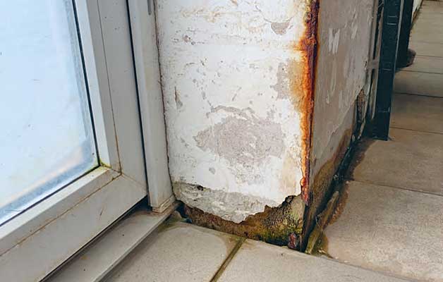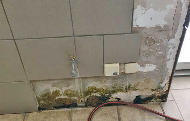 Diese Gefahr müssen wir dringend abwenden. Die optimale Luftfeuchtigkeit für die Gesundheit liegt, bei einer Raumtemperatur von 20 Grad, bei 50%. Je höher der Feuchtigkeitsgehalt in der Luft ist, umso besser kann sich der Schimmelpilz ansiedeln. Da im Hundetrakt und im Tierarzt-Raum die Feuchtigkeit aber aus dem Boden kommt, haben wir keine Chance, den Gehalt niedrig zu halten. Der Boden und die Wände sind nass und der Schimmel breitet sich unaufhaltsam aus.
