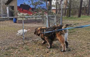 Uns erwartete hinter dem 2,5 Meter hohen geschlossenen Tor ein wütender, verzweifelt versuchender, sein Hab und Gut zu verteidigender, 80 Kilo Koloss von einem Leonberger-Mix. Ihm drohte die Tötung, wenn wir ihn nicht sichern und ins Tierheim bringen.