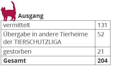 Vier von ihnen sind bei uns geblieben, eine ist gestorben, zwei haben wir vermittelt. Wie gesagt, diese Geschichten berichten lediglich von den besonders eindrucksvollen Ereignissen. Doch auch ohne diese Sonderfälle haben wir reichlich zu tun. Denn jeden Tag klingelt unser Telefon – jeden Tag retten wir Katzen. Alle unsere Geschichten würden diesen Jahresbericht sprengen. Aber auf unserer Webseite finden Sie noch weitere Notfallgeschichten. Die meisten sind durch Ihre Hilfe gut ausge – gangen. Dafür danken wir Ihnen herzlich!