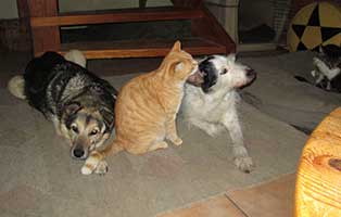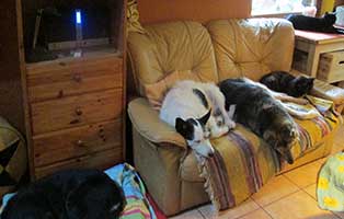 Wir haben hier kein Tierheim für Tiere, die ein neues Zuhause suchen, sondern eine Pflegestation für überwiegend alte, kranke oder nicht mehr vermittelbare Tiere. Die Hunde und zum Teil auch die Katzen, leben mit uns im Haus, im Garten und auf dem Sofa. Sie werden bei uns mit viel Zuwendung versorgt und dürfen bis an den Rest Ihres Lebens bei uns bleiben. Eine Ausnahme bilden ab und zu mal Katzen zur Zähmung, die wir dann zur Tiervermittlung freigeben.