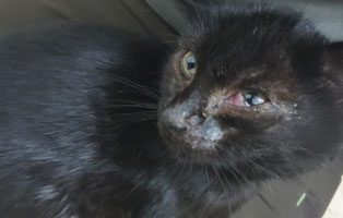 Dieser kleiner Kater, gerade mal 1kg schwer, wurde uns gebracht. Er ist stark unterernährt und viel zu dünn. Heute kann er wenigstens aus den Augen gucken, sah gestern viel schlimmer aus